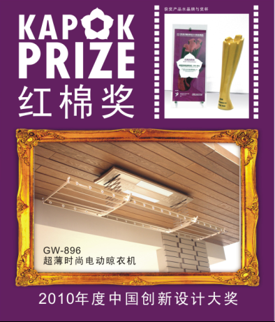 12月8日, 由广州国际设计周组委会与中国工业设计协会联合主办的2010年度中国创新设计大奖“红棉奖”评选活动颁奖典礼在广州大剧院多功能剧场举行,经组委会国内外专家评审,我司超薄电动晾衣机GW-896在众多参赛作品中脱颖而出,获得2010年度中国创新设计大奖“红棉奖”。成为晾衣架行业唯一一款获得该奖的产品,是各界权威对我司产品的高度认可,必将进一步推进我司在产品设计与研发能力上的不断超越。